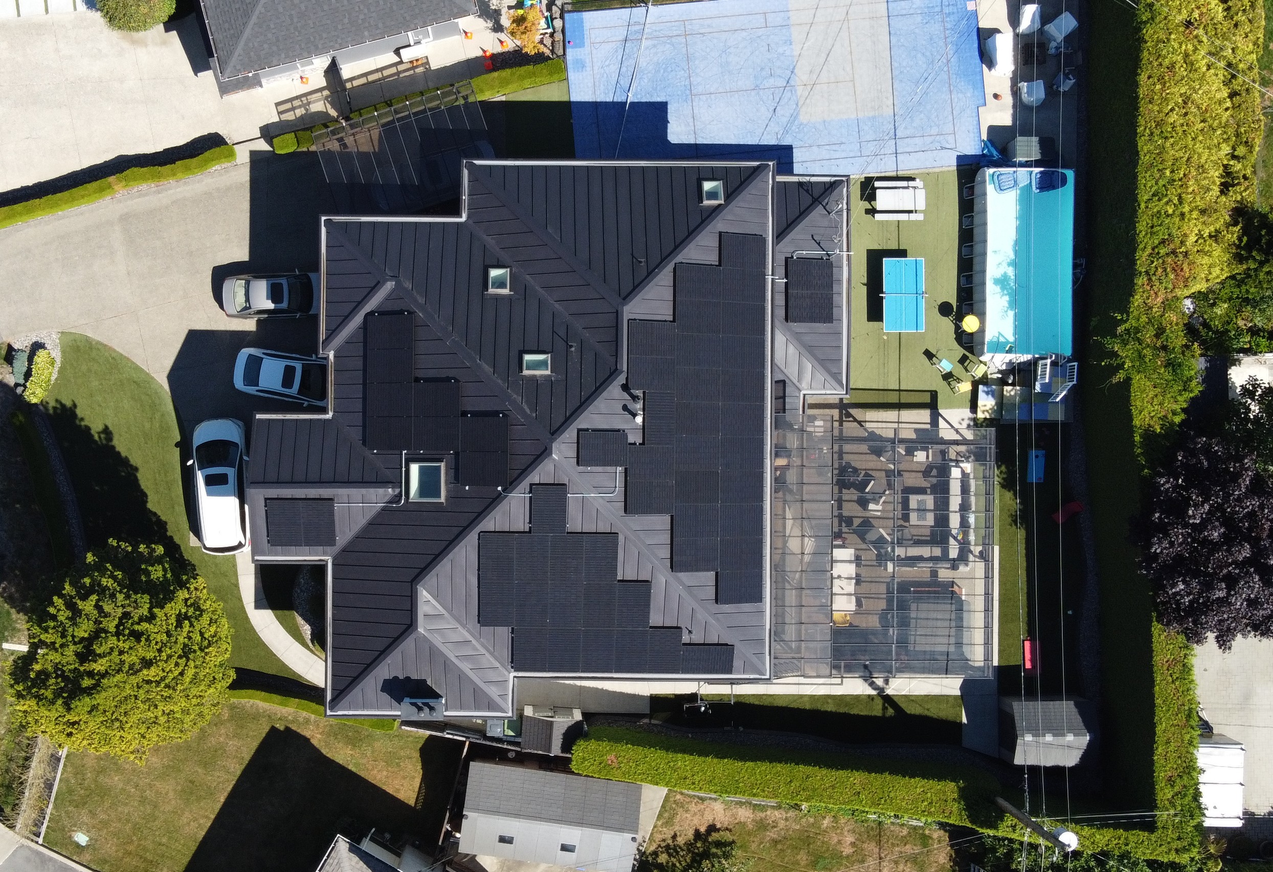 The decision to go solar grew out of the homeowners remodeling plans to turn the sprawling residence into a mini-resort for the household of seven children. The owner had sought out approval from local utility BC Hydro to upgrade the main panel from 200 Amps to 400 Amps, but was turned down because of the high demand on the grid in the neighborhood, near the Vancouver airport. The solution to the owner’s plan to consume more electricity was to generate it himself by having solar installed.
