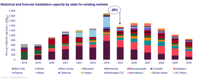 The first half of 2025 has seen a sharp dropoff in community solar installations in the United States, according to a new report by Wood Mackenzie in collaboration with the Coalition for Community Solar Access (CCSA). After a record-breaking year in 2024, the U.S. community solar market decline 36% in the first half of 2025 in a year-over-year analysis, resulting in 437 MWdc of new capacity installed.